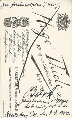 In einem Schreiben vom 17.06.1905 an das Ministerium für auswärtige Angelegenheiten erwähnt Dr. Paul Assmy seine Verlobung an Ostern 1905 sowie die geplante Heirat im Frühjahr 1906 und fragt an, ob die Eheschließung einen Grund darstellt, ihn nicht als Konsulatsarzt einzusetzen. Bevor diese Frage nicht geklärt ist, will er die Zustimmung der Braut und der Schwiegereltern nicht einholen.